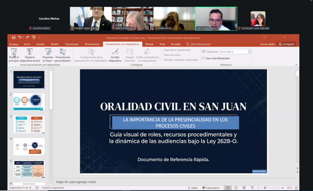 El primer módulo se desarrolló el 13 de abril a las 15.30 h. (horario de Argentina), a través de la Plataforma Zoom, y expusieron: la Dra. Patricia Bermejo, jueza de la Cámara Nacional Civil y Presidenta de la Asociación Argentina de Derecho Procesal, sobre “El Derecho Procesal entre la tradición y la era digital”, y el Dr. Juan Carlos Pérez, juez de Cámara de Apelaciones en lo Civil, Comercial y Minería del Poder Judicial de San Juan, quien disertó sobre “Oralidad en los Procesos Civiles. Importancia de la Presencialidad”.