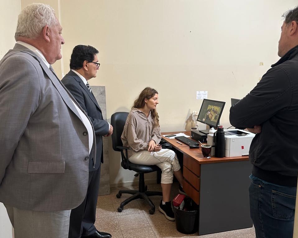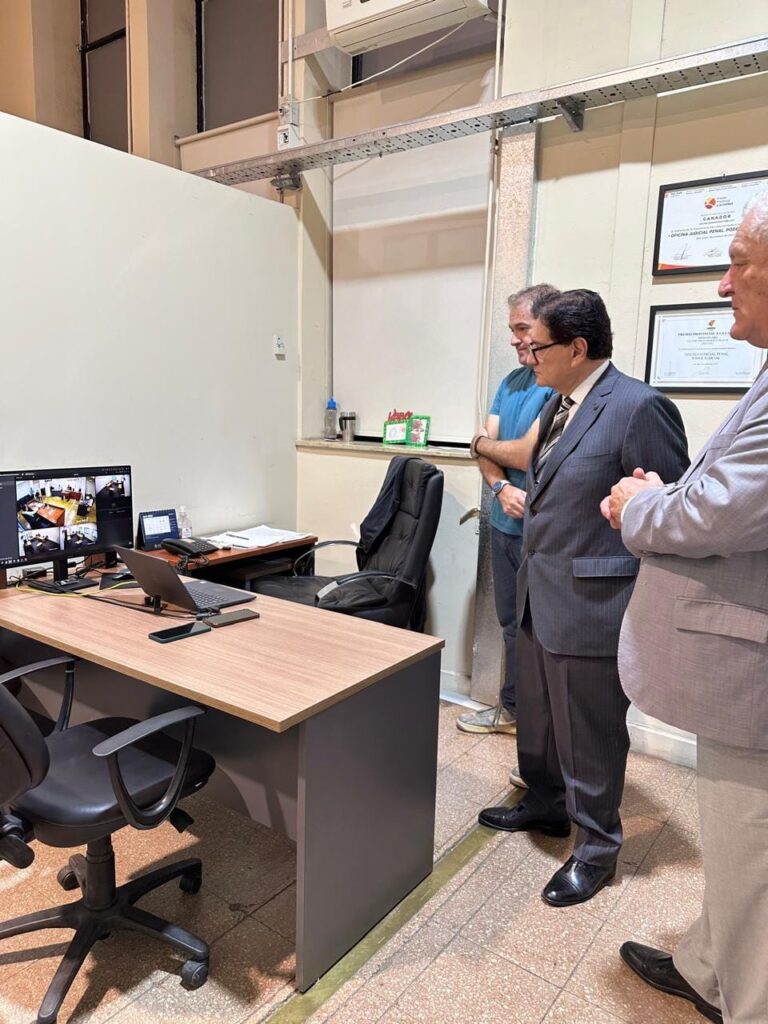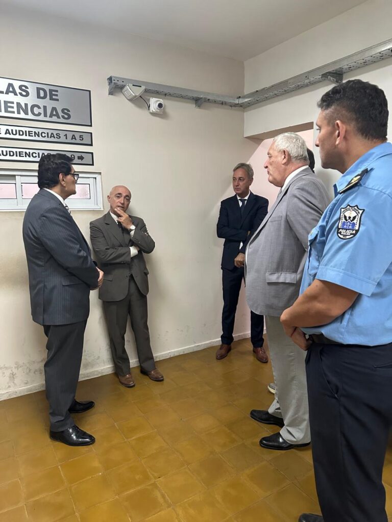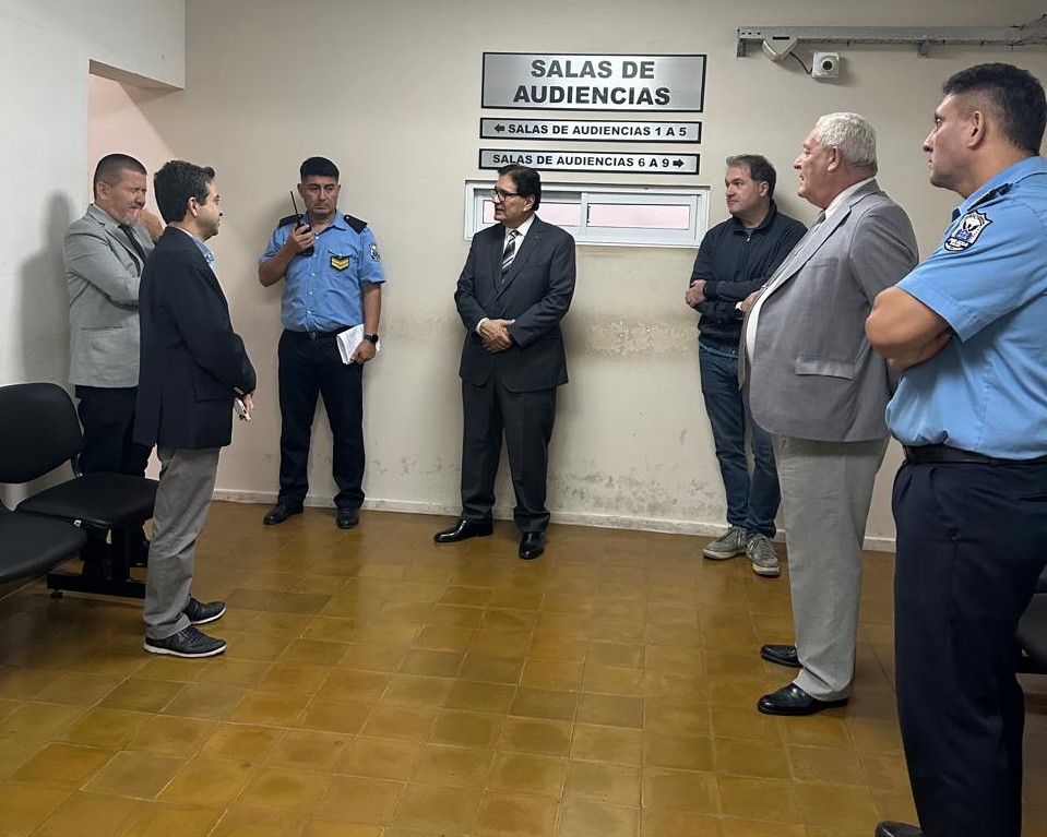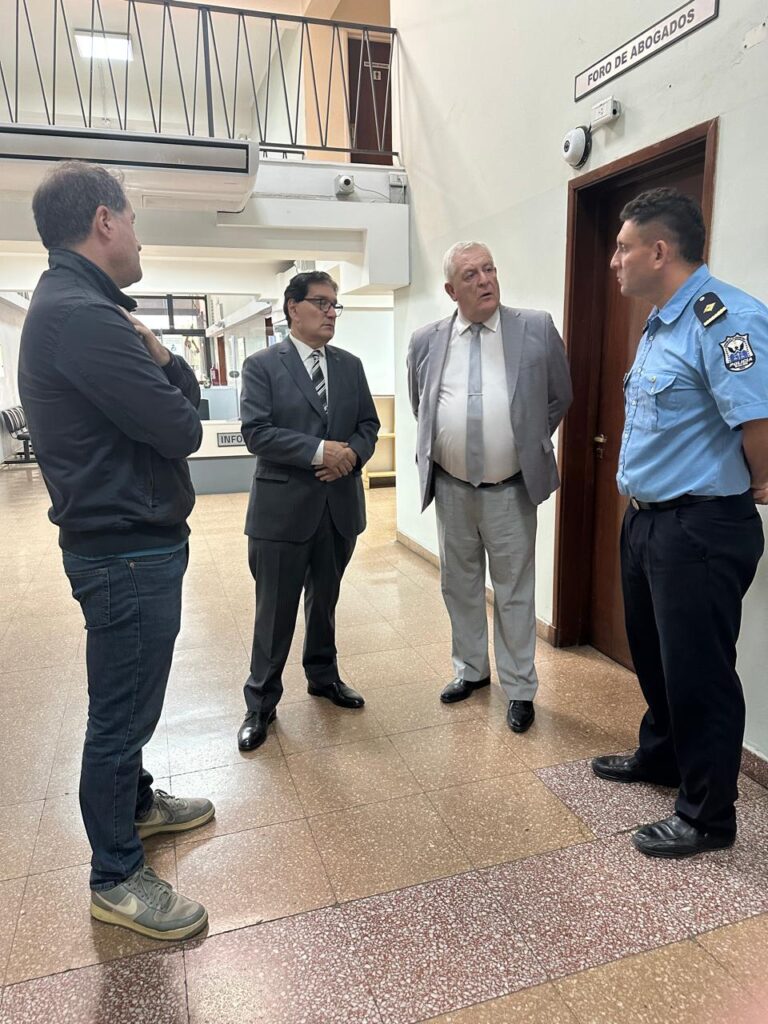 El Dr. Olivares Yapur realizó un recorrido por las instalaciones y salas de audiencias, junto al Dr. Carlos Güeglio, Supervisor General de las Oficinas Judiciales del Fuero Penal y mantuvo contacto con personal y jueces en turno. En este marco se interiorizó de las audiencias previstas, para lo cuál también mantuvo contacto con el personal policial a cargo de la seguridad de cada edificio.