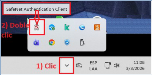 1) En el escritorio de su PC, busque en la “Barra de Tareas de Windows”, abajo a la derecha, un ícono en forma de flecha hacia arriba ^. De los íconos de aplicaciones que se mostrarán, haga doble clic en “SafeNet Authentication Client”. Ver imagen siguiente:
