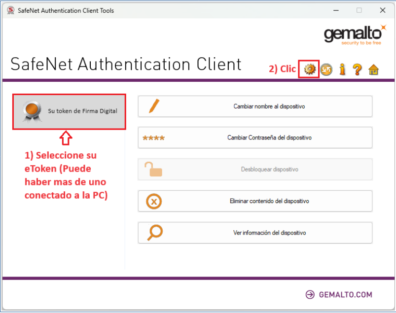 2) Al abrir la aplicación, a la izquierda de la misma, visualizará el/los eToken/s que haya conectado/s a la PC. Seleccione el suyo y haga clic en el ícono con forma de enganaje que se encuentra arriba a la derecha: