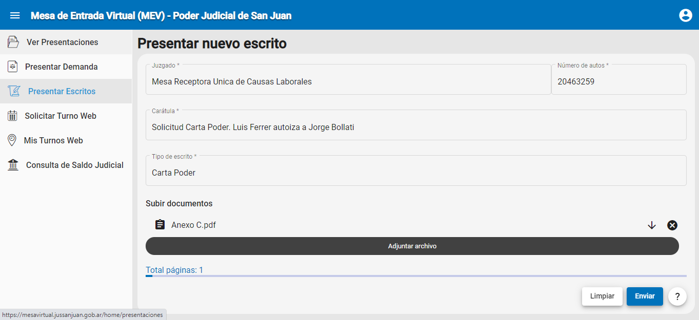 5) Tamaños de los archivos adjuntos: Respetar las limitaciones de los tamaños y formatos de los archivos que se adjuntan, según lo especificado en el instructivo actual que se encuentra en la pagina del Poder Judicial.