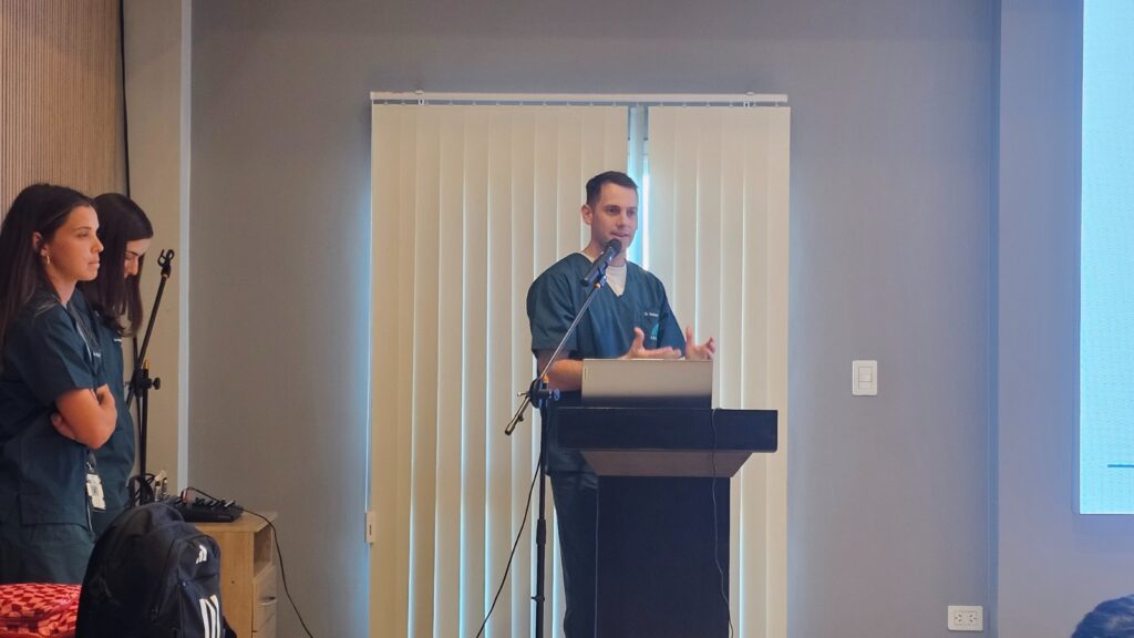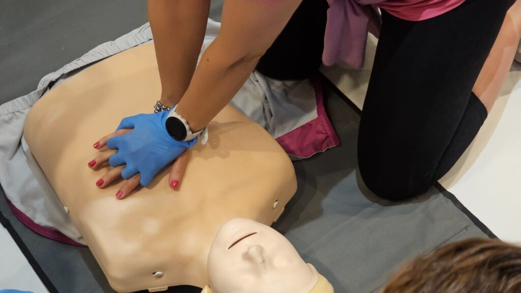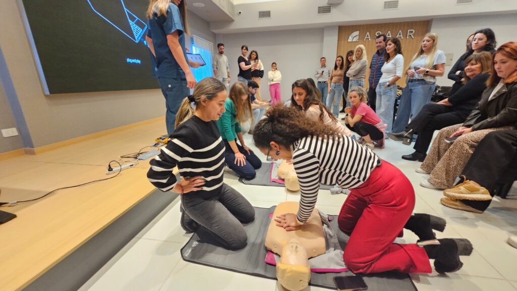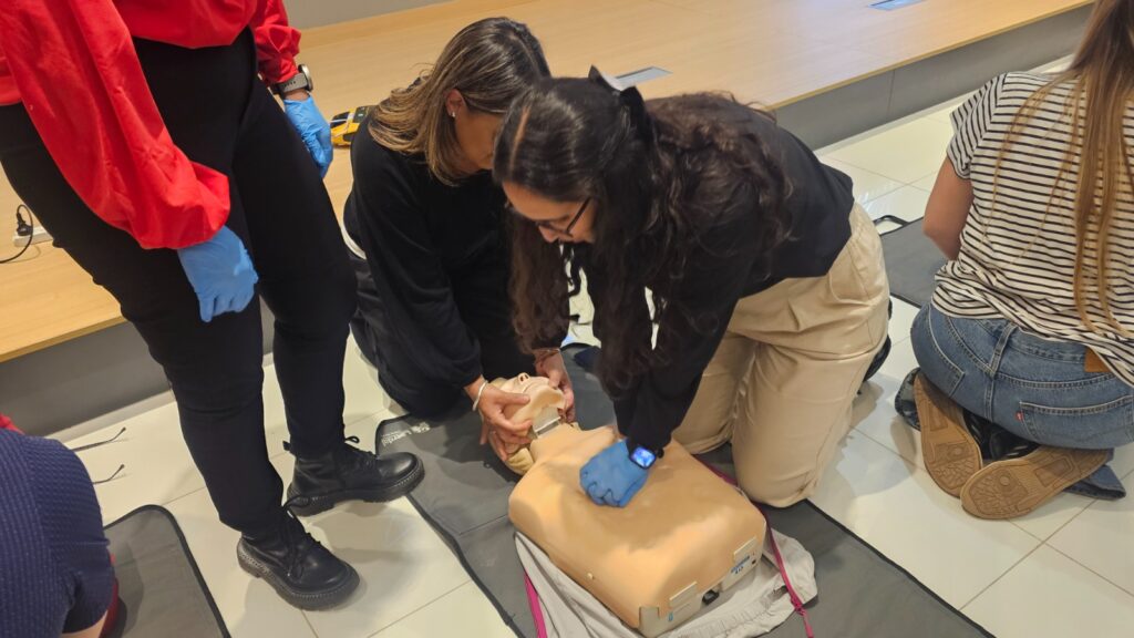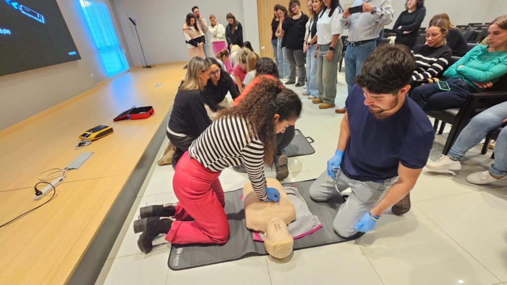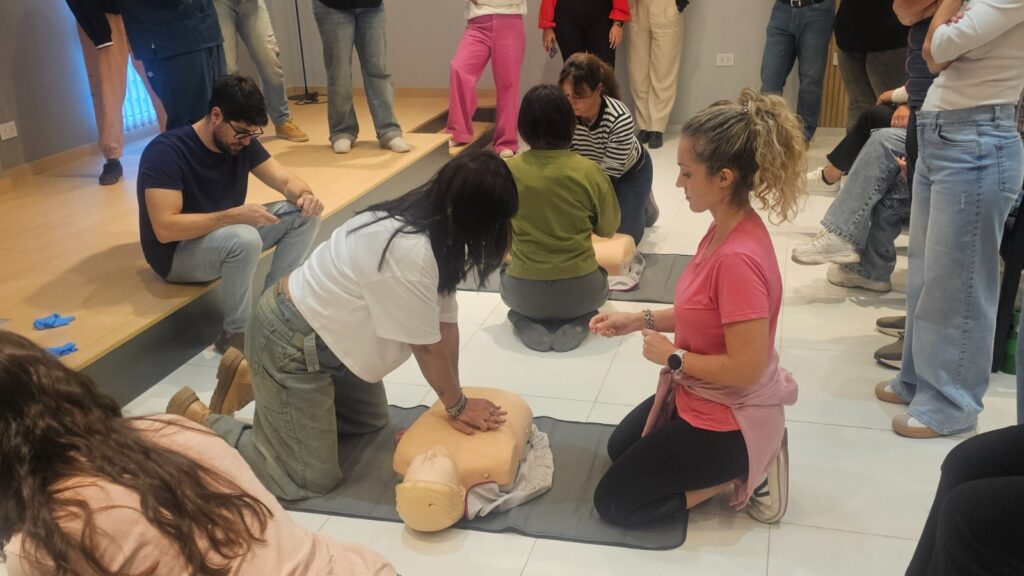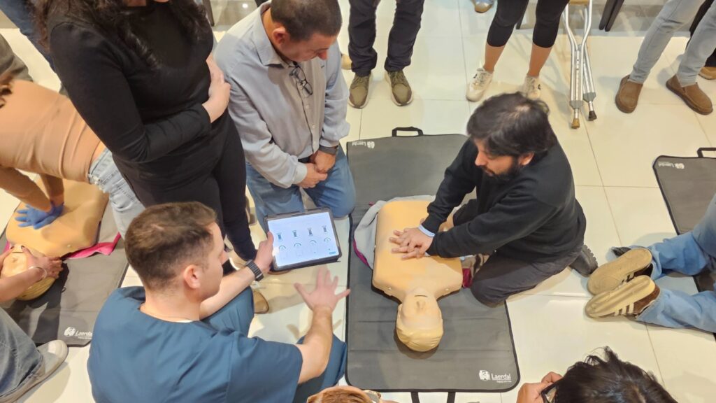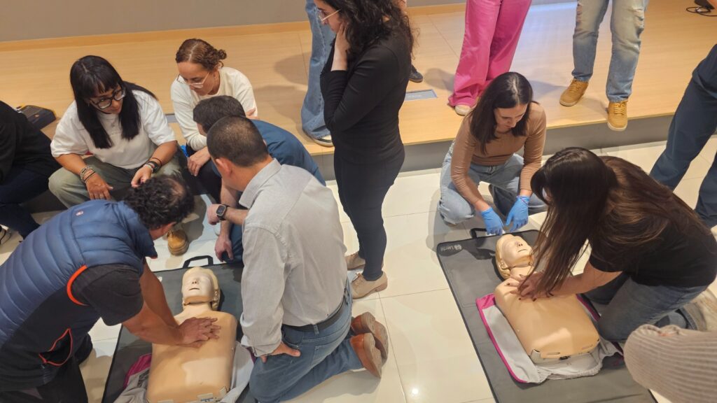 En el componente práctico, los participantes se organizaron en grupos y trabajaron con maniquíes de simulación de RCP, equipados con tecnología de retroalimentación en tiempo real que permitió evaluar y mejorar la calidad de las maniobras. Las características del espacio y el equipamiento disponible posibilitaron el desarrollo de instancias dinámicas e interactivas, favoreciendo la participación activa y la adquisición de habilidades.