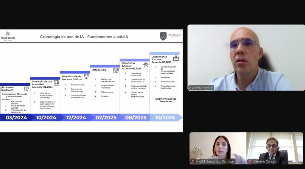 Por San Juan disertaron el Dr. Mauricio Cerezo, subsecretario Administrativo de la Corte de Justicia; el Mg. Gustavo Moyano, Jefe del Área de Inteligencia Artificial de la Dirección de Informática; y la Dra. Ana María Basualdo, funcionaria del Poder Judicial de San Juan y miembro de la Dirección de Nuevas Tecnologías de FAM.