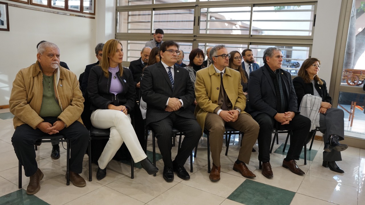 El Sr. Ministro de la Corte, Dr. Daniel Olivares Yapur, junto a la Diputada Provincial, Dra. Celina Ramella; el Presidente del Concejo Deliberante de la Municipalidad de la Ciudad de San Juan, Arq. Ariel Palma; el Concejal de la Municipalidad de la Ciudad de San Juan, Fabián Juárez y la Vicerrectora de la UNSJ, Dra. Analía Ponce