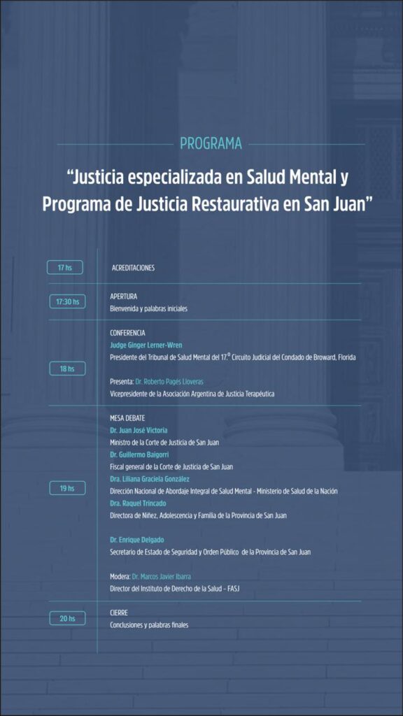 El próximo lunes se realizará la Jornada sobre “Justicia especializada en Salud mental y Programa Justicia Restaurativa en San Juan”, en la que disertará la destacada jurista Ginger Lerner-Wren, la primera jueza de Estados Unidos que presidió un Tribunal de Salud Mental.