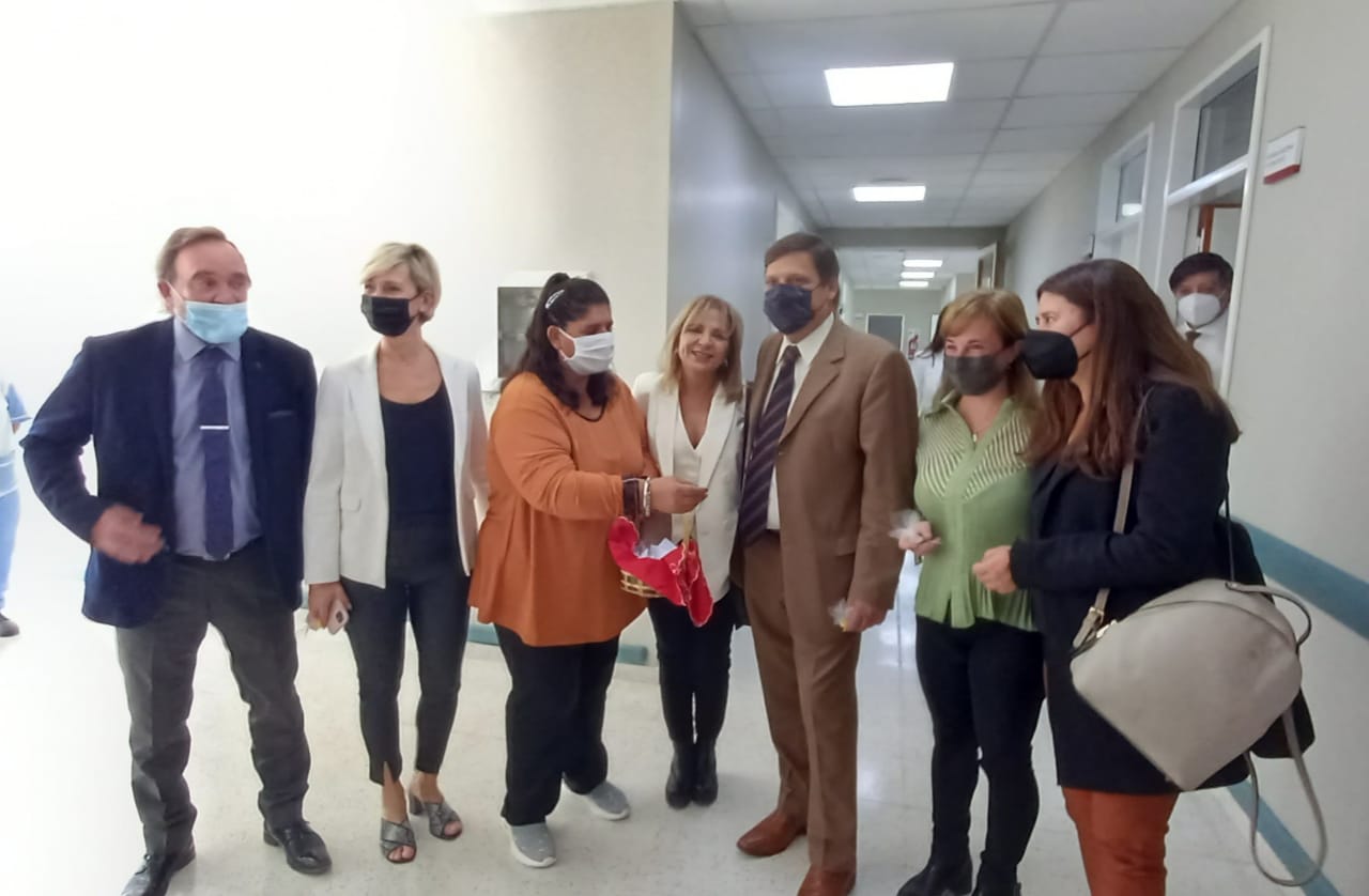 Una paciente entrega un presente al Dr. Juan José Victoria, acompañado por la Sra. Asesora de Menores, Dra. Patricia Sirera, los Sres. Jueces de Familia, Dr. Gustavo Almirón y Dra. Marianela López ; y autoridades del Hospital.