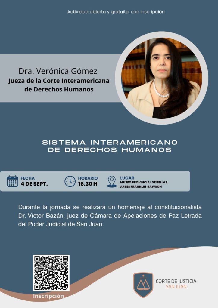 La Jueza Argentina de la Corte Interamericana de Derechos Humanos (Corte IDH), Dra. Verónica Gómez, brindará una disertación sobre el Sistema Interamericano de Derechos Humanos el día jueves 4 de septiembre, a las 16.30 h, en el Museo Provincial de Bellas Artes Franklin Rawson. La actividad es libre y gratuita y requiere inscripción previa. Link de inscripción: https://bit.ly/sistinteramericano